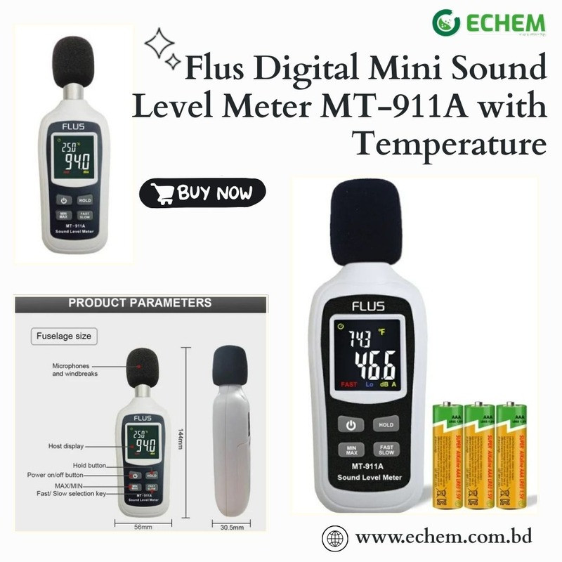 Flus Digital Mini Sound Level Meter MT-911A with Temperature Meter. This unit adopts a condenser microphone as the sensor, high configuration MCU calculation, high accuracy, and fast response. This Sound Level Meter is designed to meet the measurement requirements of safety Engineers, Health, Industrial safety offices. And sound quality control in various environments like factories, schools, construction, etc.